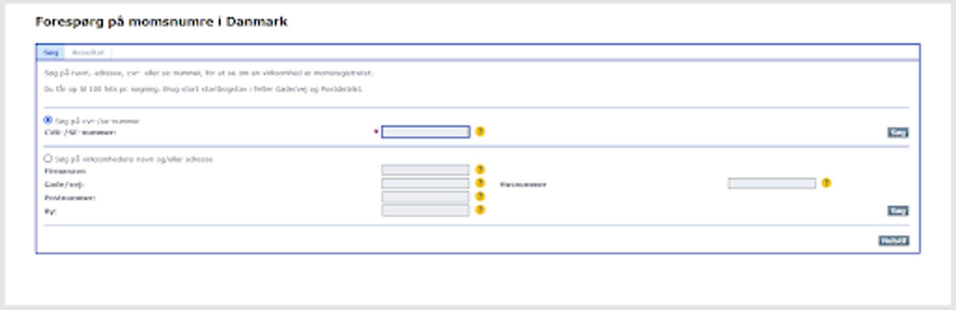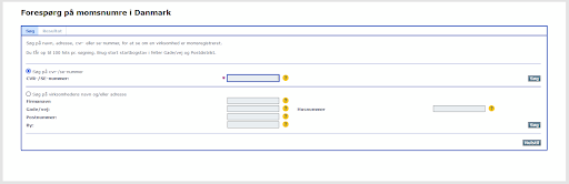 Hvis du derimod har brug for at vide, om en EU-virksomhed er momsregistreret, kan du bruge EU-Kommissionens værktøj i stedet, som du finder her . Her vil det være virksomhedens VAT-nummer, du skal søge efter.