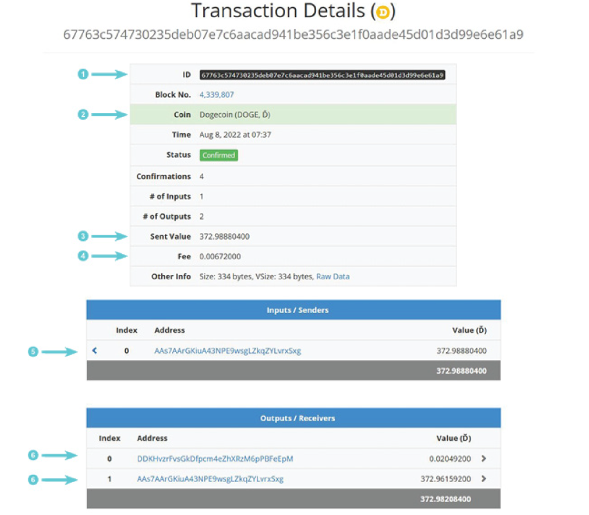 På billedet ser du en dogecoin-transaktion fundet via Chain.so – en såkaldt block reader, der gør det muligt for os at se alle transaktioner registreret på dogecoins blockchain.