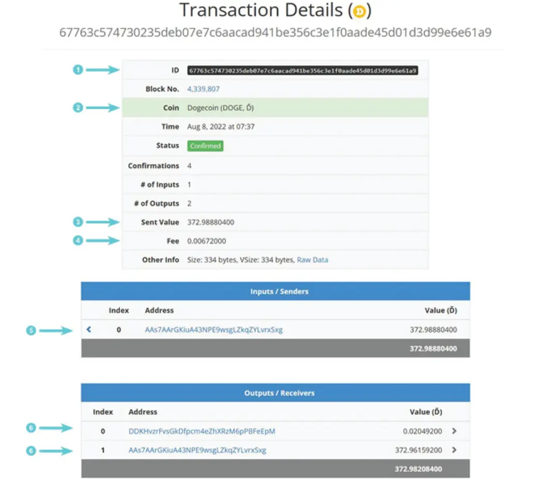 I eksemplet er der blevet overført 372,99 dogecoins. Kursen for dogecoin i august 2022 er 0,52 kr., og beløbet svarer derfor til cirka 193,50 kr.