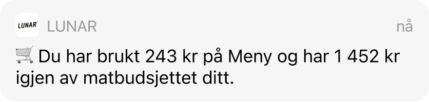 Du får ikke bare en notifikasjon når du har laget et budsjett og er i ferd med å gå over. Du får også en hver gang du bruker kortet ditt. Notifikasjoner er en av våre mest populære funksjoner, fordi de hjelper deg med å ta kontroll over pengene dine før de tar kontroll over deg.